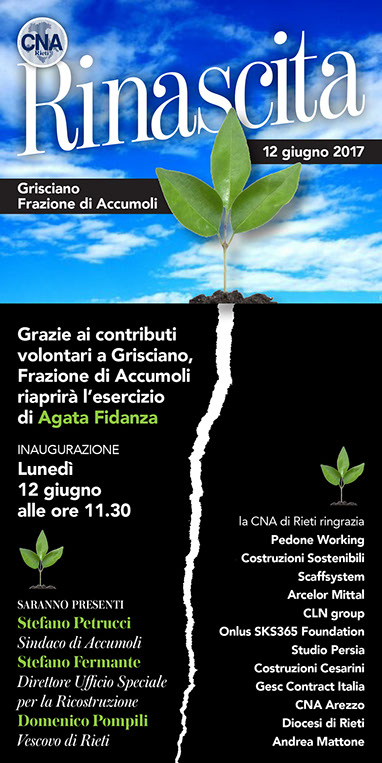 Grazie all’iniziativa della Confederazione Nazionale dell’Artigianato di Rieti è stato individuato sul territorio un progetto specifico capace di soddisfare le esigenze immediate del post-sisma. In Grisciano, frazione di Accumoli, con grande fatica era nuovamente operativo il bar del paese, punto di aggregazione sociale, luogo di confronto e reciproco conforto emotivo. Con rapidità ma anche con un altissimo standard qualitativo, era necessario disporre di uno spazio fisico riparato che fungesse da spaccio alimentare per soddisfare i primissimi bisogni di approvvigionamento.